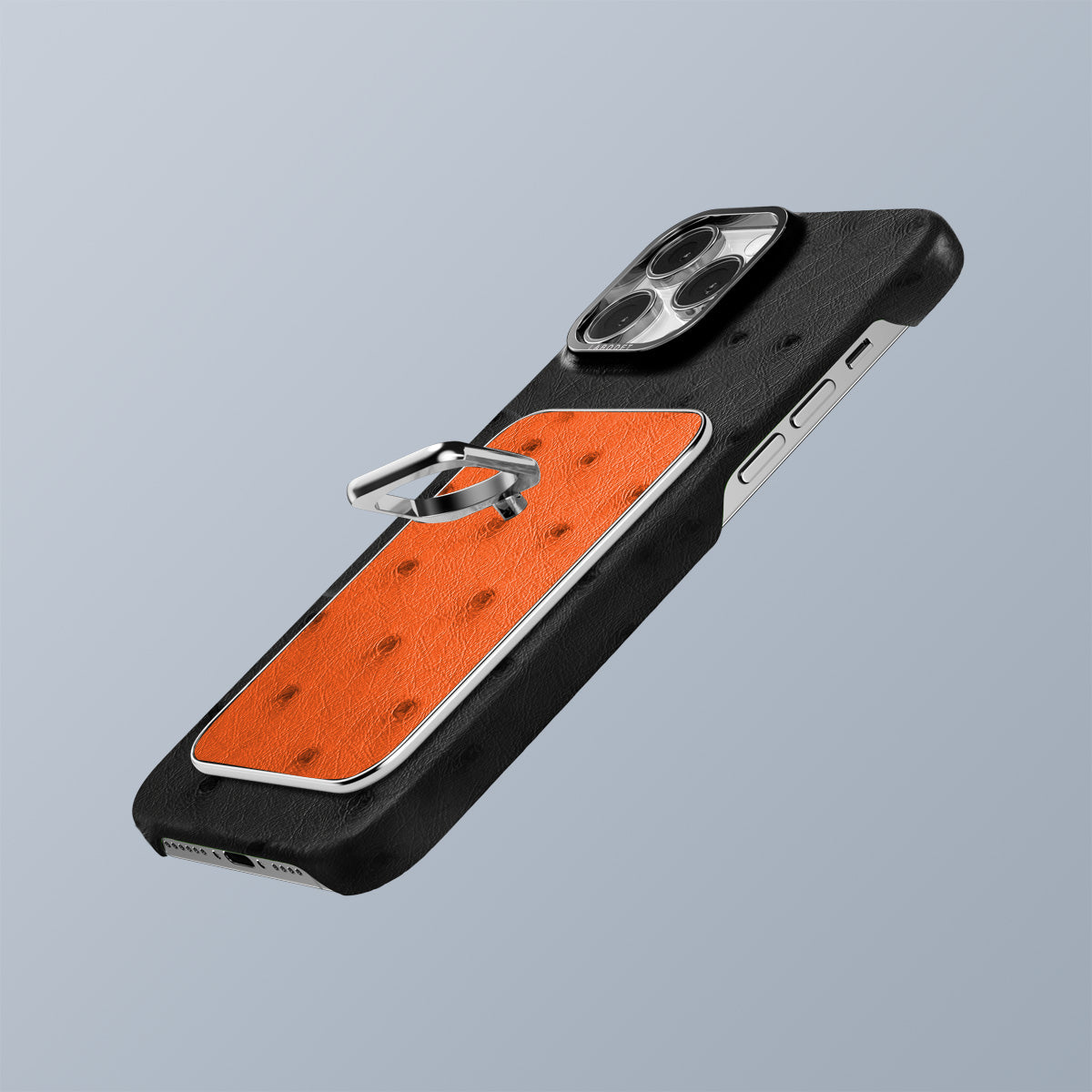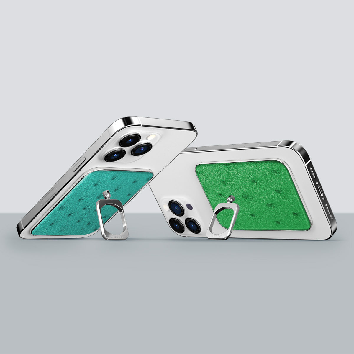 The MagSafe Ring holder fits comfortably in your hand, allows a more ergonomic grip on your iPhone, and serves as a phone kickstand. The design features a surgical-grade stainless steel frame and ring with flexible rotation up to 360 degrees. Built-in custom MagSafe magnets and nano-polymer lining ensure secure attachment to your MagSafe-enabled iPhone or MagSafe case. The Ring is decorated with genuine ostrich leather. Smart design expertly executed in Paris, France.