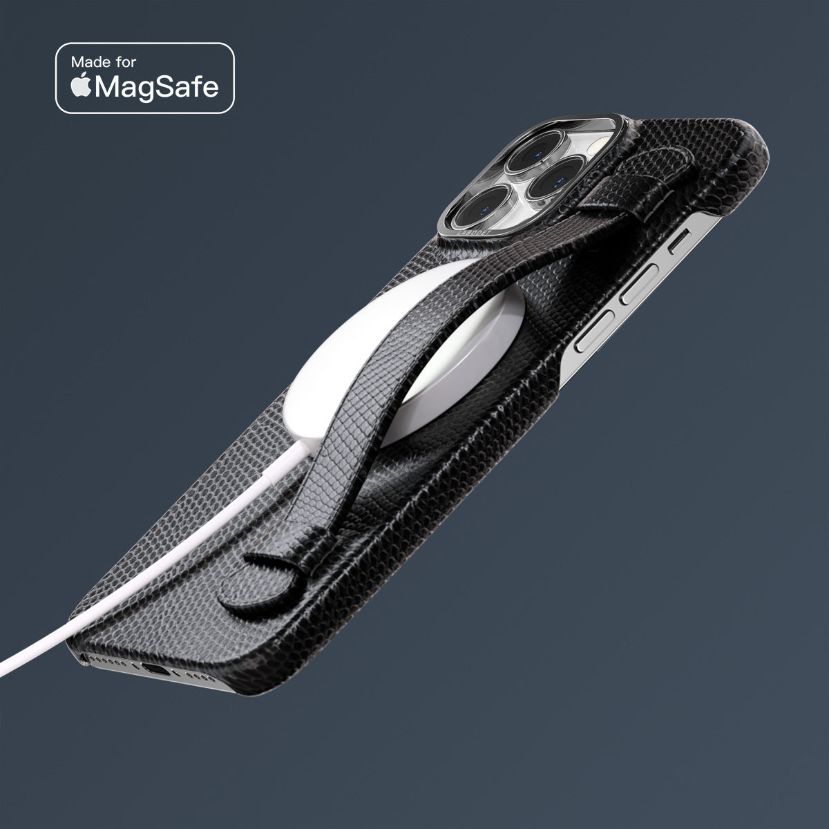 The case features refined lizard leather with very small round scales and a glossy finish. The leather strap provides extra comfort and security while holding the phone. Custom-built magnet ring allows the iPhone to be charged with MagSafe Charger while inside the case and use other MagSafe accessories. Soft Alcantara® microfiber lines the case interior. Crafted with expert attention to detail in Paris, France.