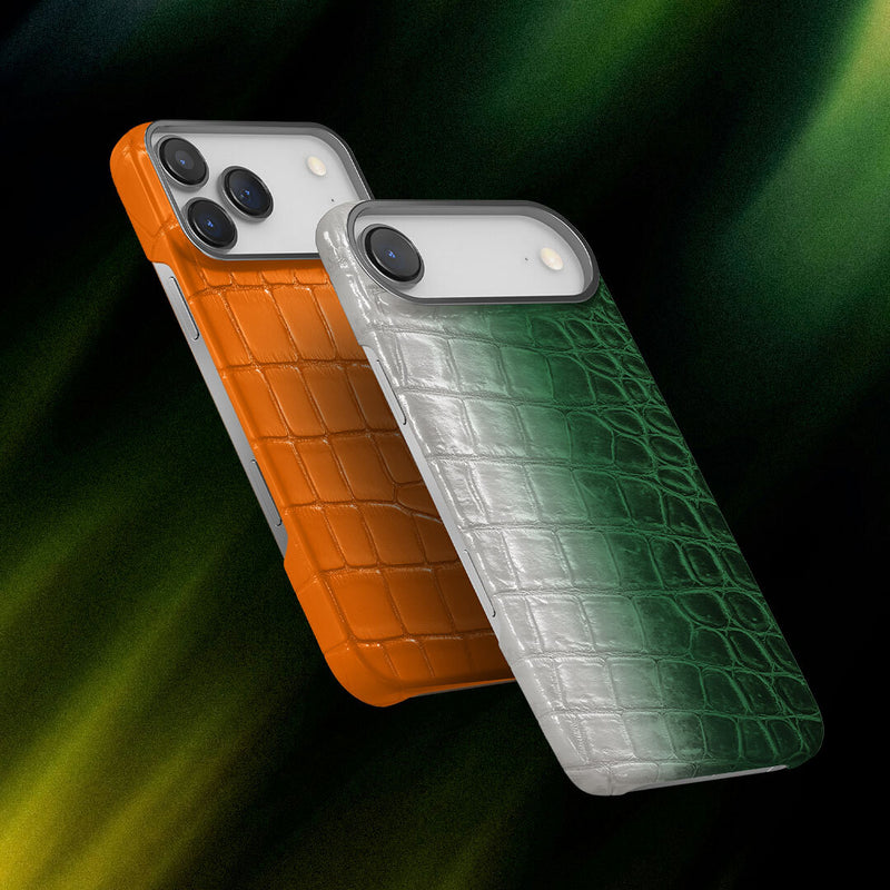 Delicate lizard leather wraps this MagSafe-compatible iPhone case. Genuine lizard leather is characterized by small round scales, a glossy finish, and a refined look. With the case on, the iPhone can be charged with MagSafe Charger and used with other MagSafe accessories. The interior of the case is lined with soft Alcantara® microfiber. Artisanal craftsmanship from Paris, France.