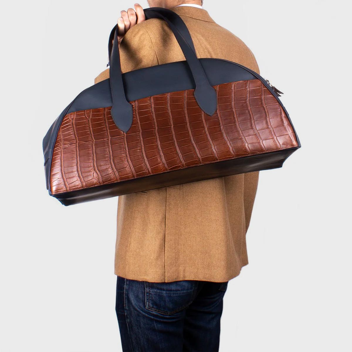 This stylish travel bag combines a durable blue rubber calf exterior with elegant brown alligator leather accents. Its spacious fabric-lined interior is perfect for organizing your essentials, making it a practical choice for any journey.