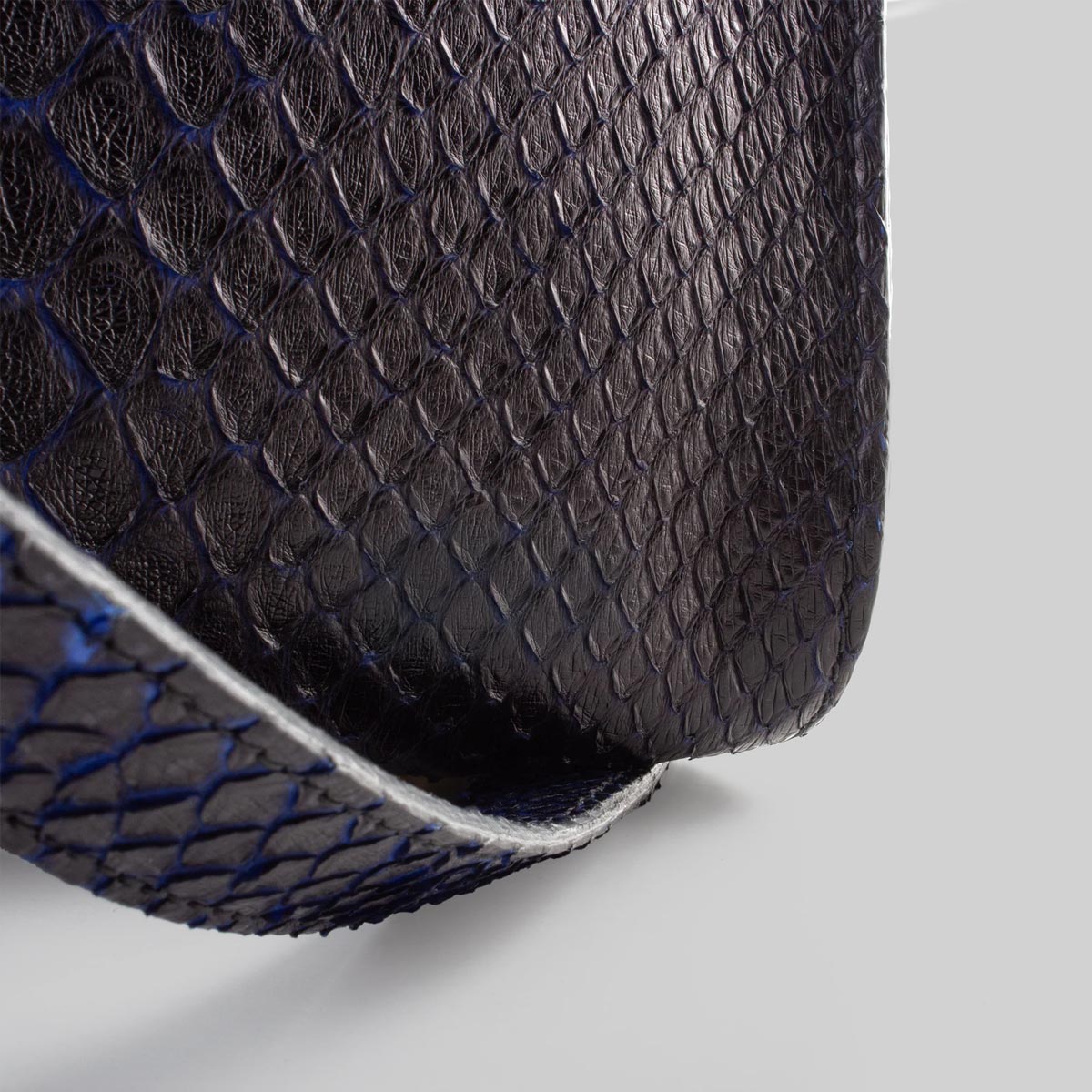 Experience elegance through this tote bag in genuine black python with a stunning blue under-scale. The bag comes with adjustable handles, allowing for comfortable shoulder carry. The interior is lined in luxurious royal blue calf leather, adding a bold contrast. Inside are two pockets for organization, including one with a secure zipper closure.