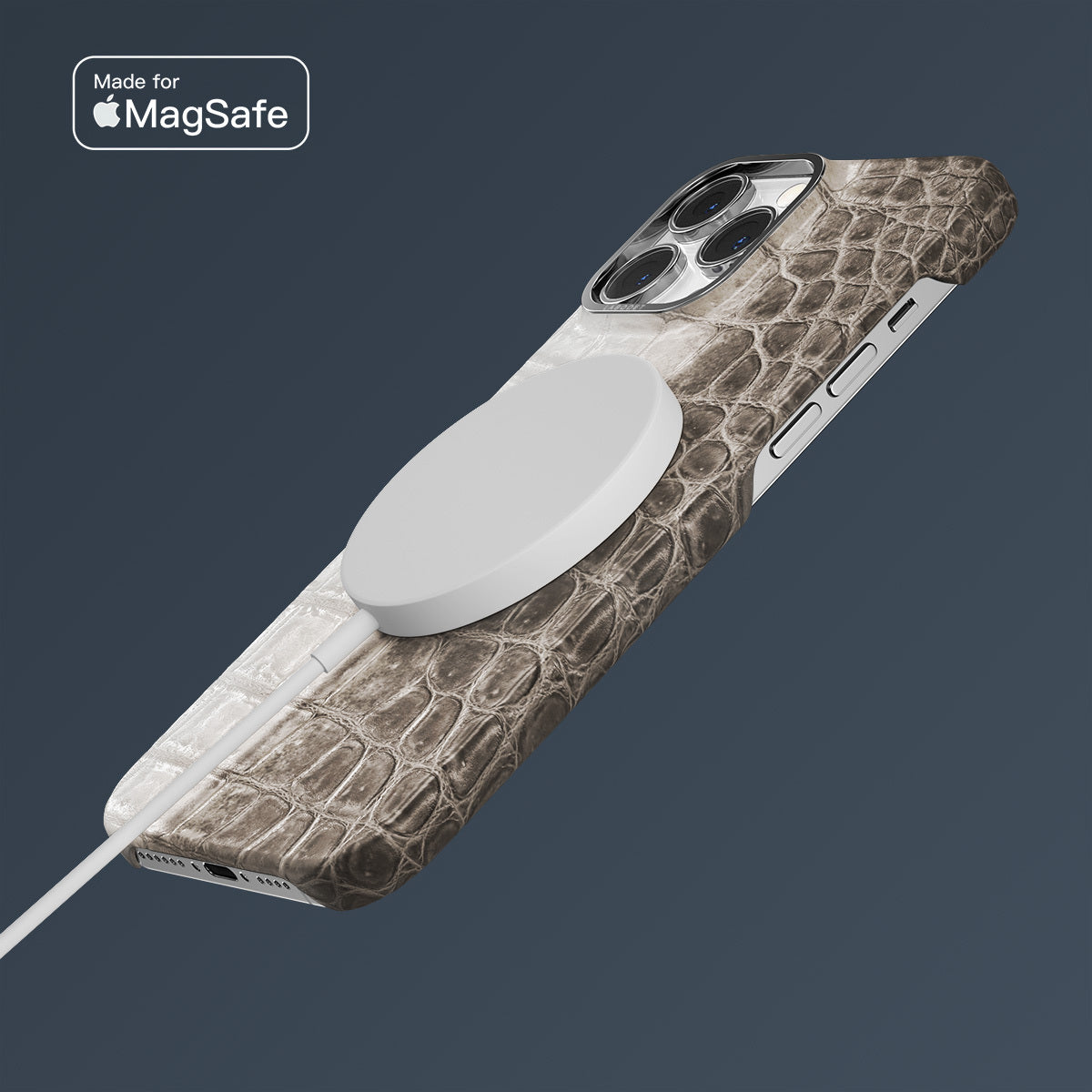 This classic snap-on iPhone case is made from rare and exclusive Nilo crocodile leather. The Himalayan mountains inspire the colors of this leather, which is achieved through a complex dyeing process. The built-in magnets in the case allow MagSafe compatibility. And the soft Alcantara® lining protects the iPhone from scratches. Crafted with traditional French techniques in Paris, France.
