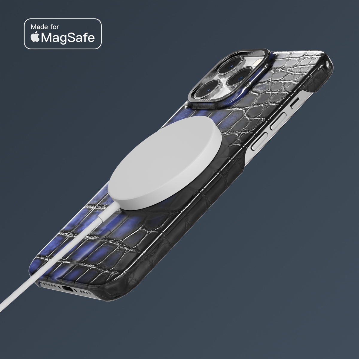 Wrapping the classic slim and MagSafe compatible case is genuine alligator leather with a manually-produced patina effect. The patina gives an instantly recognizable and chic distressed look, adding depth and vibrance to the classic colors. The interior of the case is protected with soft Alcantara® microfiber lining. Crafted by expert artisans in Paris, France.