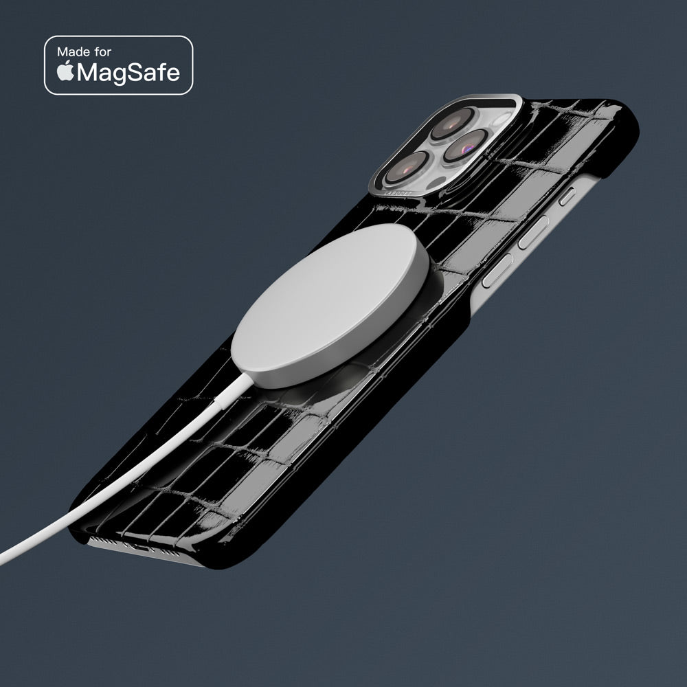 The classic snap-on slim case showcases elegant shiny alligator leather with a glossy finish. The shiny effect is achieved by extensive agate stone polishing. The case is fully compatible with MagSafe accessories and can be easily charged with Mafsafe Charger. The interior of the case is lined with soft Alcantara® microfiber. Crafted by artisans in Paris, France.